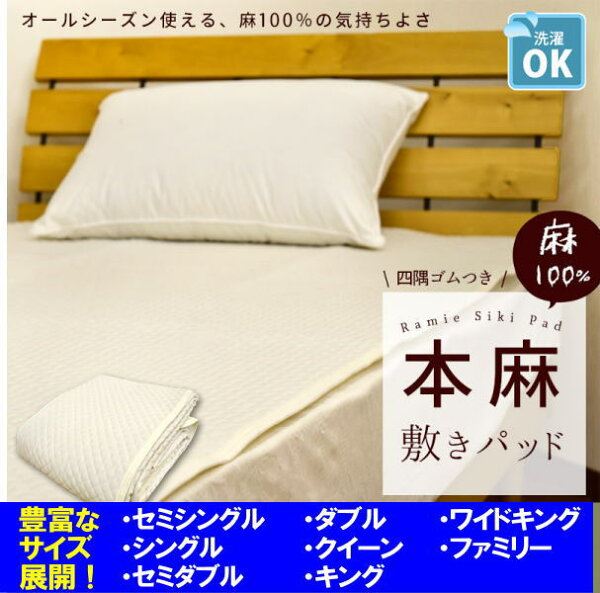 本麻敷きパッド ファミリーサイズ 240×205cm 表生地:本麻100%(ラミー麻) 裏生地:ポリエステル100% 中身:ポリエステル100% 中国製 4隅にゴム付き、敷き布団にワンタッチ装着。
