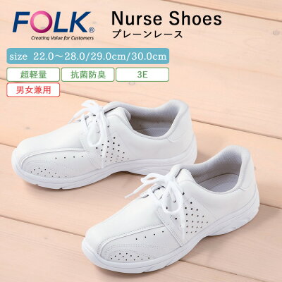 ナース シューズ 疲れにくい レディース メンズ 男女兼用 看護 FOLK プレーンレース 仕事 職場 オフィス 事務 室内履き 上履き 白 ホワイト 超軽量 病院 クリニック 介護士 医療用 通気性 快適 抗菌 防臭 3E【送料無料】