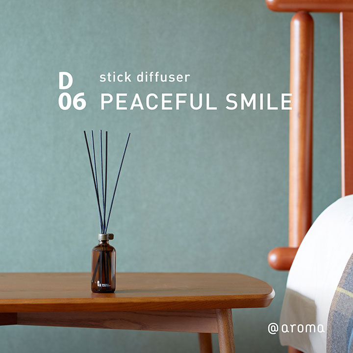 D06 ピースフルスマイル 普遍的に好まれるナチュラルな気品をそなえた、シトラスとハーブの穏やかな香り 原料:グレープフルーツ、カモミール、ベルガモット、サイプレス、ホーウッドetc 最大拡散範囲:約5畳 *最大拡散範囲は目安です。